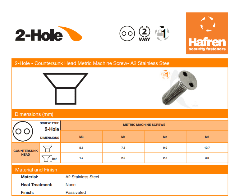 Home / Screws, Bolts & Nails / Security Fasteners / 2-Hole Drive / 2-Hole Countersunk Machine Screws Product Description M4 x 30mm 2-Hole Countersunk Security Screws - A2 Stainless Steel2-Hole Countersunk Security Screws, also known as Snake Eye® or Pig Nose, feature a flat countersunk head and a popular aesthetically pleasing 2 hole internal drive. The Snake Eye® drive has 2 holes drilled into the head which requires a 2-pin matching driver to install and remove it. The two hole drive is designed for medium torque applications.The internal pig nose drive adds a level of security to these screws, as a standard drill bit cannot be inserted. These security screws must instead be paired with a security drill bit, resulting in a tamper-proof fastening. Click Here to view the installation video. These 2-Hole Countersunk Security Screws are made from A2 Stainless Steel which provides corrosion and oxidation resistance.For larger quantities or items not listed, please email sales@gwr-fasteners.co.uk and one of our team will provide you with a quotation. Read More Specifications Thread Diameter M4 Thread Pitch 0.7mm Length Including the Head 30mm Head Diameter 7.3mm Head Length 2.2mm Material Stainless Steel (A2) Drive Size T4 Fully Threaded Yes Removable Yes Brand HAFREN Security Level 1 - Entry Level Finish Natural Condition New Product Code A2-CSK2HOLE-M4-30 Customer reviews No reviews left yet Write A Review Most RecentTop Rated Specification Thread Diameter M4 Thread Pitch 0.7mm Length Including the Head 30mm Head Diameter 7.3mm Head Length 2.2mm Material Stainless Steel (A2) Drive Size T4 Fully Threaded Yes Removable Yes Brand HAFREN Security Level 1 - Entry Level Finish Natural Condition New Product Code A2-CSK2HOLE-M4-30 Description M4 x 30mm 2-Hole Countersunk Security Screws - A2 Stainless Steel2-Hole Countersunk Security Screws, also known as Snake Eye® or Pig Nose, feature a flat countersunk head and a popular aesthetically pleasing 2 hole internal drive. The Snake Eye® drive has 2 holes drilled into the head which requires a 2-pin matching driver to install and remove it. The two hole drive is designed for medium torque applications.The internal pig nose drive adds a level of security to these screws, as a standard drill bit cannot be inserted. These security screws must instead be paired with a security drill bit, resulting in a tamper-proof fastening. Click Here to view the installation video. These 2-Hole Countersunk Security Screws are made from A2 Stainless Steel which provides corrosion and oxidation resistance.For larger quantities or items not listed, please email sales@gwr-fasteners.co.uk and one of our team will provide you with a quotation. Reviews No reviews left yet Write A Review Most RecentTop Rated Delivery & Returns Customer Reviews M4 x 30mm 2-Hole Countersunk Security Screws - A2 Stainless Steel Item in Stock (225 Available) Product Code A2-CSK2HOLE-M4-30 Need More?Additional stock available in: 5 - 7 Days £0.59 Quantity Range Unit Price Unit Saving 1 - 4 £0.59 No Saving 5 - 9 £0.51 £0.08 10 - 24 £0.43 £0.16 25 - 49 £0.35 £0.24 50 - 99 £0.31 £0.28 100 - 249 £0.27 £0.32 250 - 499 £0.25 £0.34 500 - 999 £0.24 £0.35 1000 - 4999 £0.22 £0.37 5000+ £0.20 £0.39 Login to add this product to your wishlist. You Will Earn 0 points which is the equivalent of £0.00 Often purchased with Item in Stock M4 / No.8 2-Hole Security Drill Bit 0 review(s) Need More?Additional stock available in: 5 - 7 Days Add to cart Quickview Out of stock M4 / No.8 2-Hole Security Screwdriver 0 review(s) Need More?Additional stock available in: 5 - 7 Days Add to cart Quickview