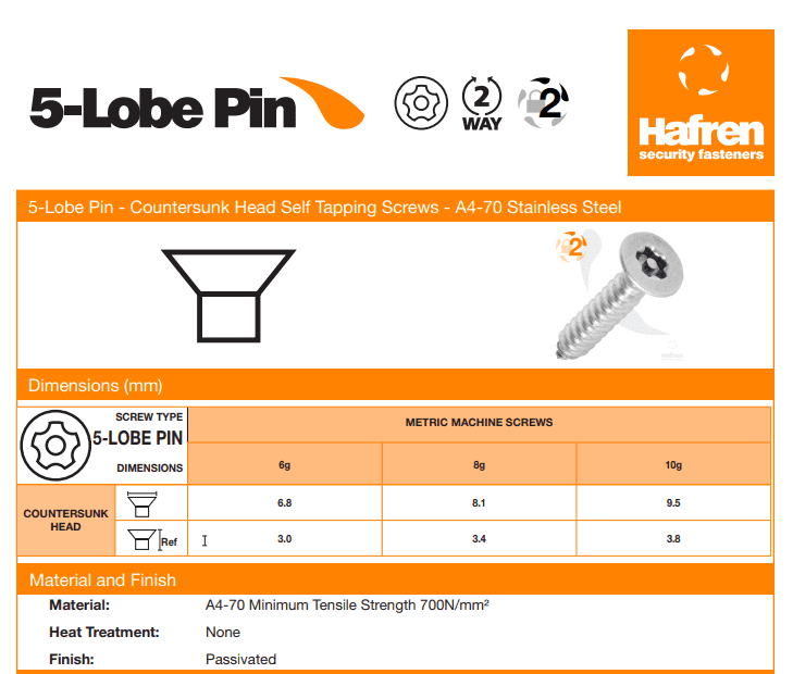Home / Screws, Bolts & Nails / Security Fasteners / 5-Lobe Pin / 5-Lobe Pin Countersunk Self Tapping Screws Product Description No.8 x 2" 5-Lobe Pin Countersunk Security Self Tapping Screws - A4 Stainless Steel - Box of 1005-Lobe Pin Button Head Security Screws, successor to the Resistorx, feature a flat countersunk head and an internal 5-lobe pin socket drive instead of 6 providing a higher level of security. The 5-Lobe Pin security drive offers an improved tamper resistance compared to the more commonly available 6-Lobe Pin drive; as the tooling is more specialised and as a result harder for members of the general public to get hold of. The self-tapping tip is designed to be used with pre-drilled pilot holes into which the screw will tap its own threads.The internal 5-lobe pin drive adds a level of security to these screws, as a standard torx bit & 6-lobe pin cannot be inserted. These security screws must instead be paired with a security drill bit, resulting in a tamper-proof fastening. Click Here to view the installation video. These 5-Lobe Pin Countersunk Head Security Screws are made from A4 Stainless Steel which provides corrosion and oxidation resistance as well as increased resistance in harsh chemical and outdoor environments.For larger quantities or items not listed, please email sales@gwr-fasteners.co.uk and one of our team will provide you with a quotation. Read More Specifications Thread Diameter No.8 (4.2mm) Length Including the Head 2" (50.8mm) Head Diameter 8.1mm Head Length 3.4mm Material Stainless Steel (A4-70) Drive Size F20-B Removable Yes Brand HAFREN Fully Threaded Yes Security Level 2 - Enhanced Security Finish Natural Condition New Product Code A4-CSK5LPIN-8-2 Customer reviews No reviews left yet Write A Review Most RecentTop Rated Specification Thread Diameter No.8 (4.2mm) Length Including the Head 2" (50.8mm) Head Diameter 8.1mm Head Length 3.4mm Material Stainless Steel (A4-70) Drive Size F20-B Removable Yes Brand HAFREN Fully Threaded Yes Security Level 2 - Enhanced Security Finish Natural Condition New Product Code A4-CSK5LPIN-8-2 Description No.8 x 2" 5-Lobe Pin Countersunk Security Self Tapping Screws - A4 Stainless Steel - Box of 1005-Lobe Pin Button Head Security Screws, successor to the Resistorx, feature a flat countersunk head and an internal 5-lobe pin socket drive instead of 6 providing a higher level of security. The 5-Lobe Pin security drive offers an improved tamper resistance compared to the more commonly available 6-Lobe Pin drive; as the tooling is more specialised and as a result harder for members of the general public to get hold of. The self-tapping tip is designed to be used with pre-drilled pilot holes into which the screw will tap its own threads.The internal 5-lobe pin drive adds a level of security to these screws, as a standard torx bit & 6-lobe pin cannot be inserted. These security screws must instead be paired with a security drill bit, resulting in a tamper-proof fastening. Click Here to view the installation video. These 5-Lobe Pin Countersunk Head Security Screws are made from A4 Stainless Steel which provides corrosion and oxidation resistance as well as increased resistance in harsh chemical and outdoor environments.For larger quantities or items not listed, please email sales@gwr-fasteners.co.uk and one of our team will provide you with a quotation. Reviews No reviews left yet Write A Review Most RecentTop Rated Delivery & Returns Customer Reviews No.8 x 2" 5-Lobe Pin Countersunk Security Self Tapping Screws - A4 Stainless Steel - Box of 100 Out of stock Product Code A4-CSK5LPIN-8-2 Need More?Additional stock available in: 5 - 7 Days £55.68 Sorry this item is out of stock but can still be purchased. Login to add this product to your wishlist. You Will Earn 66 points which is the equivalent of £3.30 Often purchased with Item in Stock No.8 5-Lobe Pin Security Drill Bit 0 review(s) Need More?Additional stock available in: 5 - 7 Days Add to cart Quickview