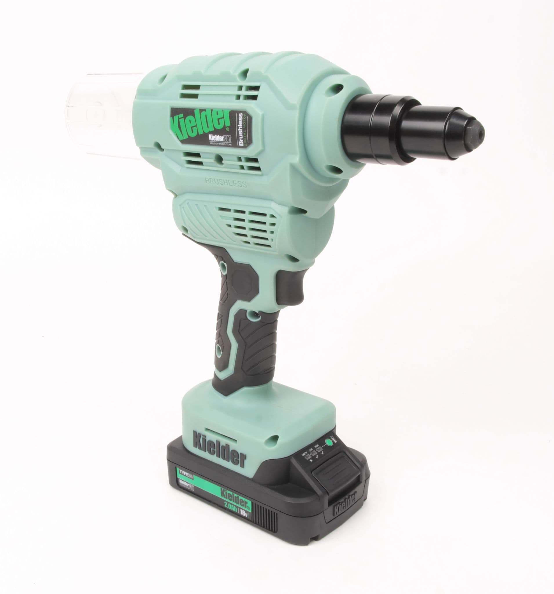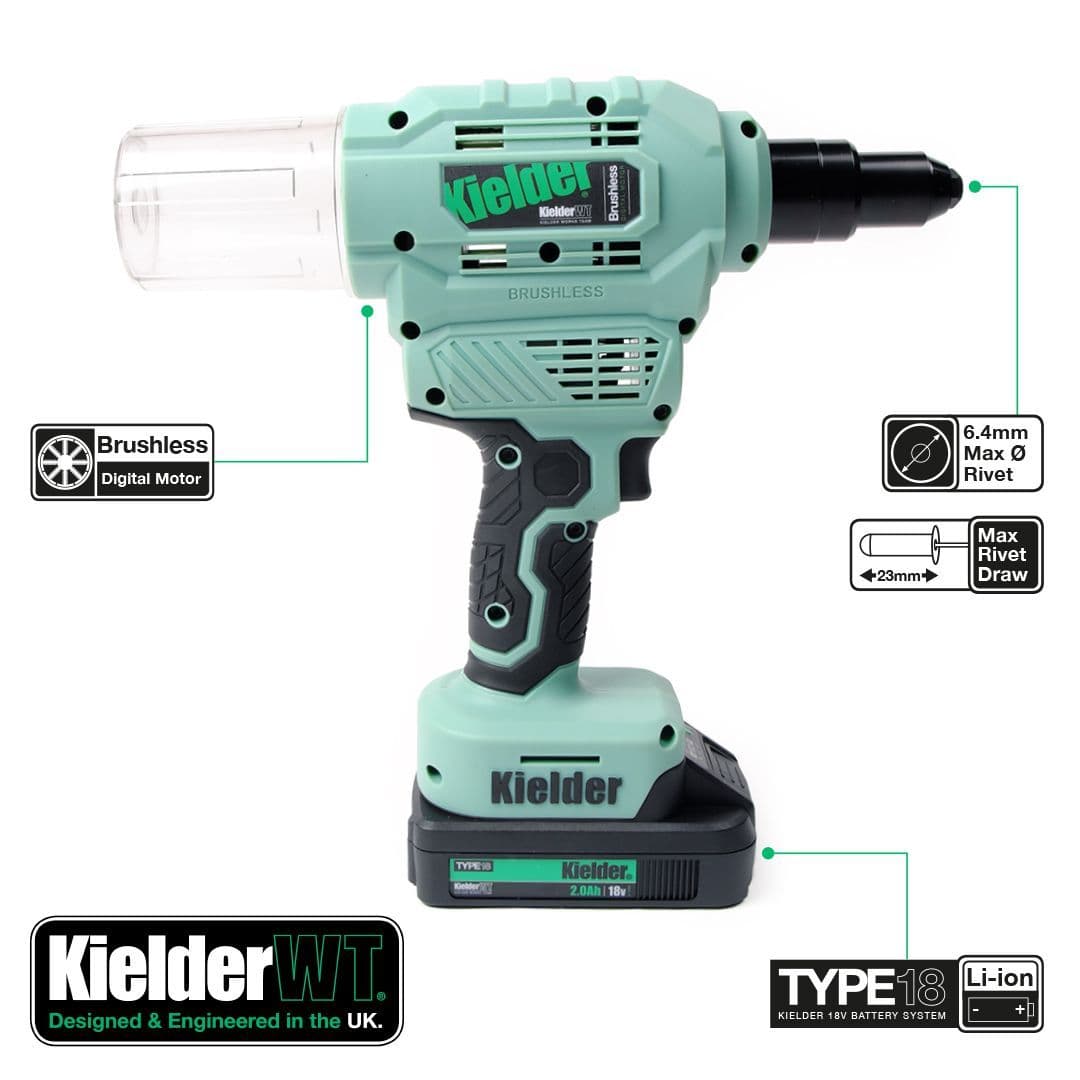 Home / Tooling / Power Tools / Riveters View more images Product Description 18V TYPE18 Riveter with 2 x 2.0Ah Batteries Heavy-duty 18v Brushless Riveter with huge capacity for up to Pop 6.4mm rivets. Designed for daily use in industry, it boasts a powerful pulling force of 9000Nm and 23mm stroke length. The high performance brushless motor and precision engineered internal mechanism provides long service life. Also features soft grip handle and removable chamber, at rear of tool, to collect spent rivet shafts. Includes four interchangeable front nozzles for various rivet sizes, from 2.4mm to 6.4mm, plus tool for quick nozzle change. Please note: This tool is not suitable for use with structural rivets such as Monobolts. Professional quality digital brushless motor works with a precision engineered internal mechanism for longer service life Removable chamber collects spent rivet shafts Approximately 1400 x 5mm Aluminium Rivets per 5.0Ah battery charge Approximately 1200 x 5mm Stainless Steel Rivets per 5.0Ah battery charge Compatible with Kielder's interchangeable TYPE18 18v Li-ion battery system 3 year manufacturers warranty when registered with Kielder, terms and conditions apply. Key Specification: Max Working Force: 9000Nm Max Pop Rivet Diameter: 6.4mm Stroke: 23mm Weight (with 5.0Ah battery): 2.3kg Weight (with 2.0Ah battery): 1.9kg Tool Length: 202mm (without rear chamber attached) Tool Length: 275mm (with rear chamber attached) Motor: Digital Brushless Vibration: 2.5m/s2 INCLUDES: Riveter, 2 x 2.0Ah 18v Li-ion Batteries, Charger, 4 x Front Nozzles, Nozzle Change Tool, Belt Clip, Pro Carry Case. This is not a stock item therefore please allow 1-3 working days for dispatch. As this is not kept as a stock item, this is non-returnable & non-refundable. Read More Specifications Product Code KWT-009-02 Customer reviews No reviews left yet Write A Review Most RecentTop Rated Description 18V TYPE18 Riveter with 2 x 2.0Ah Batteries Heavy-duty 18v Brushless Riveter with huge capacity for up to Pop 6.4mm rivets. Designed for daily use in industry, it boasts a powerful pulling force of 9000Nm and 23mm stroke length. The high performance brushless motor and precision engineered internal mechanism provides long service life. Also features soft grip handle and removable chamber, at rear of tool, to collect spent rivet shafts. Includes four interchangeable front nozzles for various rivet sizes, from 2.4mm to 6.4mm, plus tool for quick nozzle change. Please note: This tool is not suitable for use with structural rivets such as Monobolts. Professional quality digital brushless motor works with a precision engineered internal mechanism for longer service life Removable chamber collects spent rivet shafts Approximately 1400 x 5mm Aluminium Rivets per 5.0Ah battery charge Approximately 1200 x 5mm Stainless Steel Rivets per 5.0Ah battery charge Compatible with Kielder's interchangeable TYPE18 18v Li-ion battery system 3 year manufacturers warranty when registered with Kielder, terms and conditions apply. Key Specification: Max Working Force: 9000Nm Max Pop Rivet Diameter: 6.4mm Stroke: 23mm Weight (with 5.0Ah battery): 2.3kg Weight (with 2.0Ah battery): 1.9kg Tool Length: 202mm (without rear chamber attached) Tool Length: 275mm (with rear chamber attached) Motor: Digital Brushless Vibration: 2.5m/s2 INCLUDES: Riveter, 2 x 2.0Ah 18v Li-ion Batteries, Charger, 4 x Front Nozzles, Nozzle Change Tool, Belt Clip, Pro Carry Case. This is not a stock item therefore please allow 1-3 working days for dispatch. As this is not kept as a stock item, this is non-returnable & non-refundable. Specification Product Code KWT-009-02 Reviews No reviews left yet Write A Review Most RecentTop Rated Delivery & Returns Customer Reviews Riveter with 2 x 2.0Ah Batteries - Kielder 18V TYPE18 Item in Stock (10 Available) Product Code KWT-009-02 Dispatch Lead Time: 1 - 2 Working Days £242.49 Login to add this product to your wishlist. You Will Earn 290 points which is the equivalent of £14.50