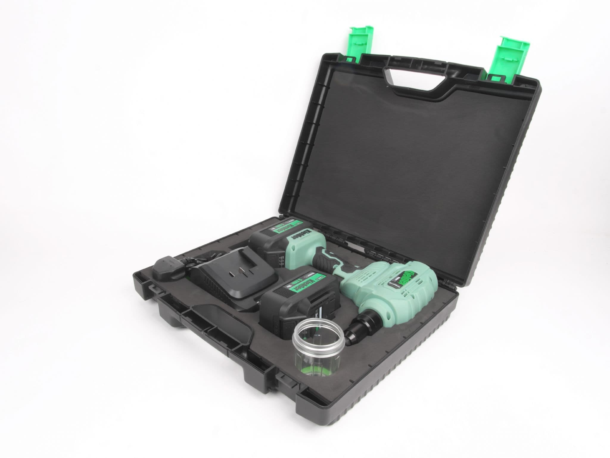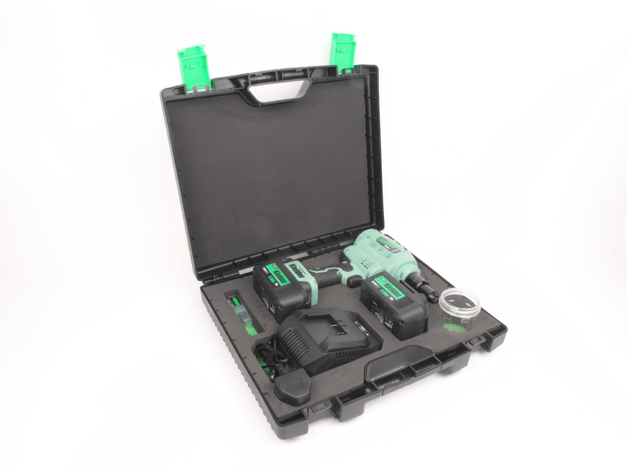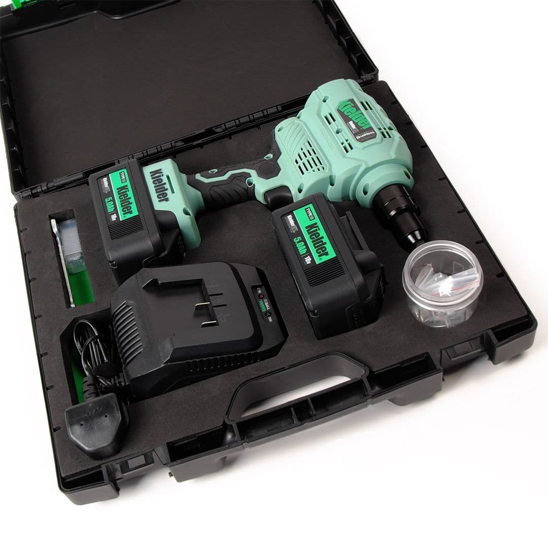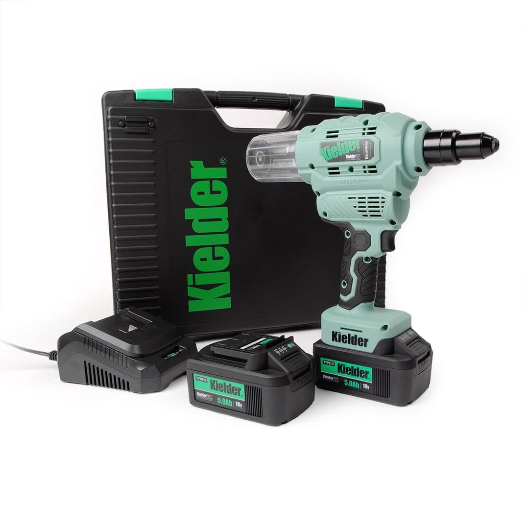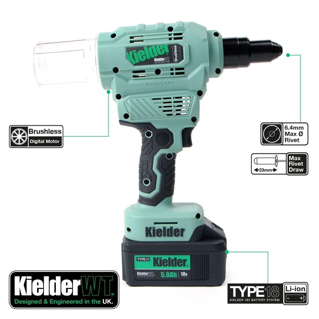 Home / Tooling / Power Tools / Riveters View more images Product Description 18V TYPE18 Riveter with 2 x 5.0Ah Batteries Heavy-duty 18v Brushless Riveter with huge capacity for up to Pop 6.4mm rivets. Designed for daily use in industry, it boasts a powerful pulling force of 9000Nm and 23mm stroke length. The high performance brushless motor and precision engineered internal mechanism provides long service life. Also features soft grip handle and removable chamber, at rear of tool, to collect spent rivet shafts. Includes four interchangeable front nozzles for various rivet sizes, from 2.4mm to 6.4mm, plus tool for quick nozzle change. Please note: This tool is not suitable for use with structural rivets such as Monobolts. Professional quality digital brushless motor works with a precision engineered internal mechanism for longer service life Removable chamber collects spent rivet shafts Approximately 1400 x 5mm Aluminium Rivets per 5.0Ah battery charge Approximately 1200 x 5mm Stainless Steel Rivets per 5.0Ah battery charge Compatible with Kielder's interchangeable TYPE18 18v Li-ion battery system 3 year manufacturers warranty when registered with Kielder, terms and conditions apply. Key Specification: Max Working Force: 9000Nm Max Pop Rivet Diameter: 6.4mm Stroke: 23mmWeight (with 5.0Ah battery): 2.3kg Weight (with 2.0Ah battery): 1.9kg Tool Length: 202mm (without rear chamber attached) Tool Length: 275mm (with rear chamber attached) Motor: Digital Brushless Vibration: 2.5m/s2 INCLUDES: Riveter, 2 x 5.0Ah 18v Li-ion Batteries, Charger, 4 x Front Nozzles, Nozzle Change Tool, Belt Clip, Pro Carry Case. This is not a stock item therefore please allow 1-3 working days for dispatch. As this is not kept as a stock item, this is non-returnable & non-refundable. Read More Specifications Product Code KWT-009-04 Customer reviews No reviews left yet Write A Review Most RecentTop Rated Description 18V TYPE18 Riveter with 2 x 5.0Ah Batteries Heavy-duty 18v Brushless Riveter with huge capacity for up to Pop 6.4mm rivets. Designed for daily use in industry, it boasts a powerful pulling force of 9000Nm and 23mm stroke length. The high performance brushless motor and precision engineered internal mechanism provides long service life. Also features soft grip handle and removable chamber, at rear of tool, to collect spent rivet shafts. Includes four interchangeable front nozzles for various rivet sizes, from 2.4mm to 6.4mm, plus tool for quick nozzle change. Please note: This tool is not suitable for use with structural rivets such as Monobolts. Professional quality digital brushless motor works with a precision engineered internal mechanism for longer service life Removable chamber collects spent rivet shafts Approximately 1400 x 5mm Aluminium Rivets per 5.0Ah battery charge Approximately 1200 x 5mm Stainless Steel Rivets per 5.0Ah battery charge Compatible with Kielder's interchangeable TYPE18 18v Li-ion battery system 3 year manufacturers warranty when registered with Kielder, terms and conditions apply. Key Specification: Max Working Force: 9000Nm Max Pop Rivet Diameter: 6.4mm Stroke: 23mmWeight (with 5.0Ah battery): 2.3kg Weight (with 2.0Ah battery): 1.9kg Tool Length: 202mm (without rear chamber attached) Tool Length: 275mm (with rear chamber attached) Motor: Digital Brushless Vibration: 2.5m/s2 INCLUDES: Riveter, 2 x 5.0Ah 18v Li-ion Batteries, Charger, 4 x Front Nozzles, Nozzle Change Tool, Belt Clip, Pro Carry Case. This is not a stock item therefore please allow 1-3 working days for dispatch. As this is not kept as a stock item, this is non-returnable & non-refundable. Specification Product Code KWT-009-04 Reviews No reviews left yet Write A Review Most RecentTop Rated Delivery & Returns Customer Reviews Riveter with 2 x 5.0Ah Batteries - Kielder 18V TYPE18 Item in Stock (10 Available) Product Code KWT-009-04 Dispatch Lead Time: 1 - 2 Working Days £289.99 Login to add this product to your wishlist. You Will Earn 347 points which is the equivalent of £17.35