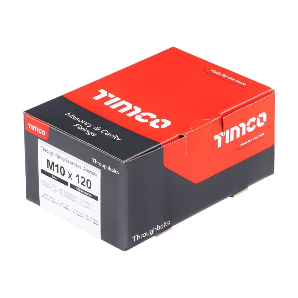 Home / Masonry & Cavity Fixings / Masonry & Concrete Fixings / Throughbolt Product Description TIMCO M10 x 120 Throughbolts - Zinc - Box of 50A versatile, torque controlled through fixing for use in a wide range of anchoring applications into concrete. Complete with hex full nut and washer. NOTE: If no torque wrench is available, tighten the nut 3 to 4 full turns from finger tight. TIMCO Brochure Page available here - https://cdn.pimber.ly/public/asset/raw/66fe9fceef898dbc872f1916/3f6fa292/67893e7cafb65b045ecf9cfa/timco-brochure-v25_95.PDFFor larger quantities or items not listed, please email sales@gwr-fasteners.co.uk and one of our team will provide you with a quotation. Read More Specifications Brand TIMCO Product Code 10120TB Customer reviews No reviews left yet Write A Review Most RecentTop Rated Description TIMCO M10 x 120 Throughbolts - Zinc - Box of 50A versatile, torque controlled through fixing for use in a wide range of anchoring applications into concrete. Complete with hex full nut and washer. NOTE: If no torque wrench is available, tighten the nut 3 to 4 full turns from finger tight. TIMCO Brochure Page available here - https://cdn.pimber.ly/public/asset/raw/66fe9fceef898dbc872f1916/3f6fa292/67893e7cafb65b045ecf9cfa/timco-brochure-v25_95.PDFFor larger quantities or items not listed, please email sales@gwr-fasteners.co.uk and one of our team will provide you with a quotation. Reviews No reviews left yet Write A Review Most RecentTop Rated Attributes Brand TIMCO Product Code 10120TB Delivery & Returns Customer Reviews TIMCO M10 x 120 Throughbolts - Zinc - Box of 50 Item in Stock (100 Available) Product Code 10120TB Dispatch Lead Time: 2 - 3 Working Days £22.12 Login to add this product to your wishlist. You Will Earn 26 points which is the equivalent of £1.30